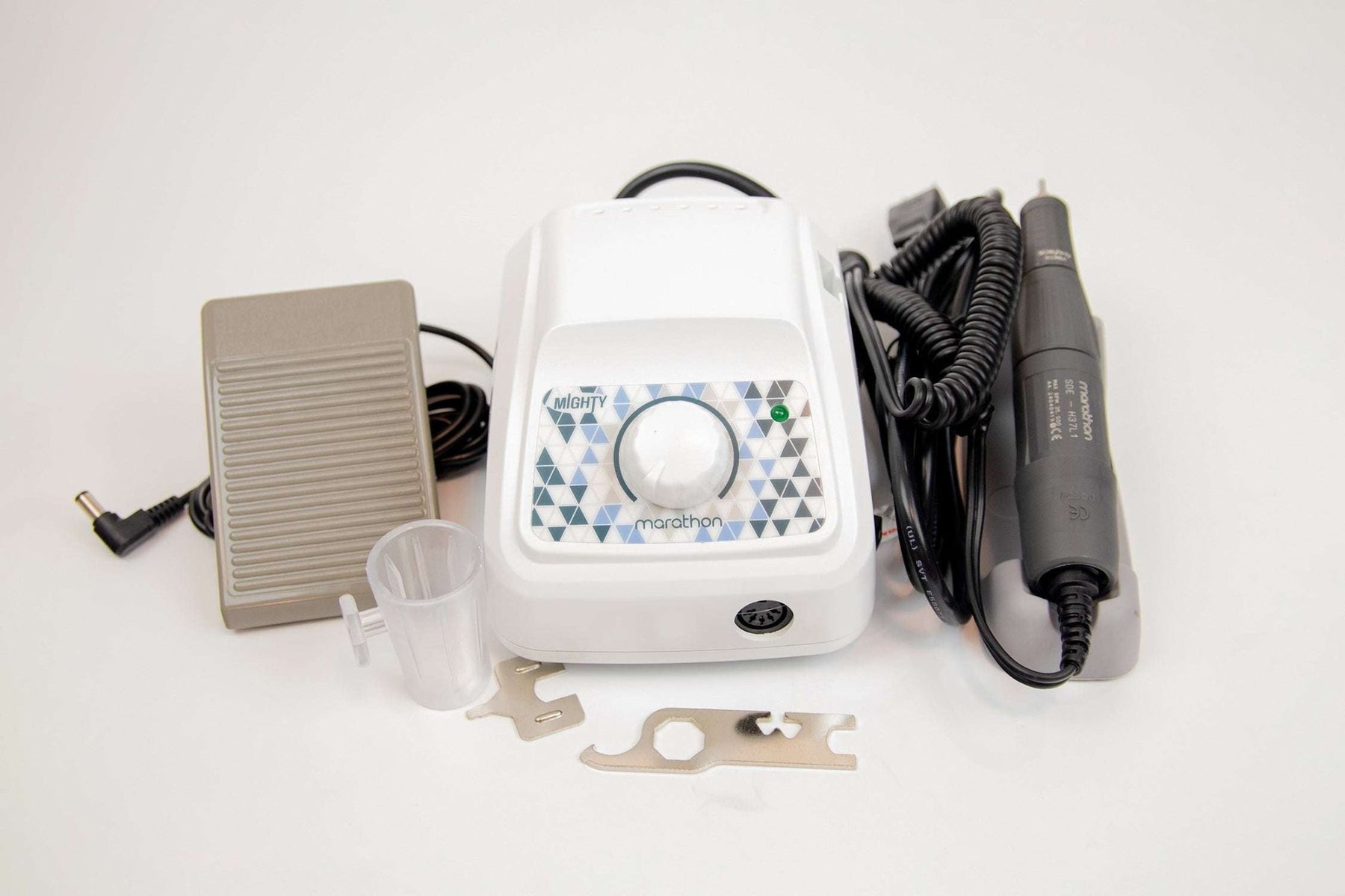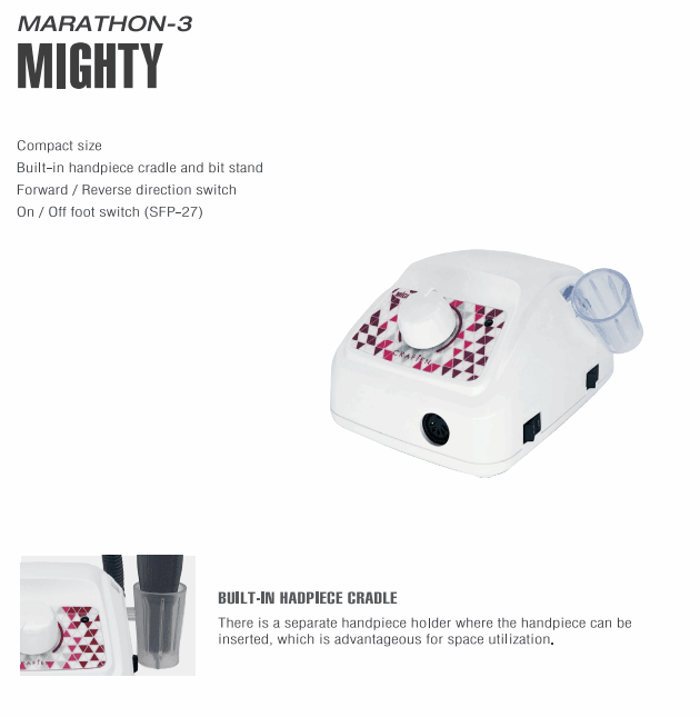 Электропила Marathon Mighty от Saeyang — это компактная и мощная профессиональная электропила, произведенная в Южной Корее. Благодаря скорости вращения до 35 000 об/мин и низкому уровню вибрации она идеально подходит для точного маникюра и периодического педикюра. Выберите подходящую вам насадку из нескольких совместимых вариантов.